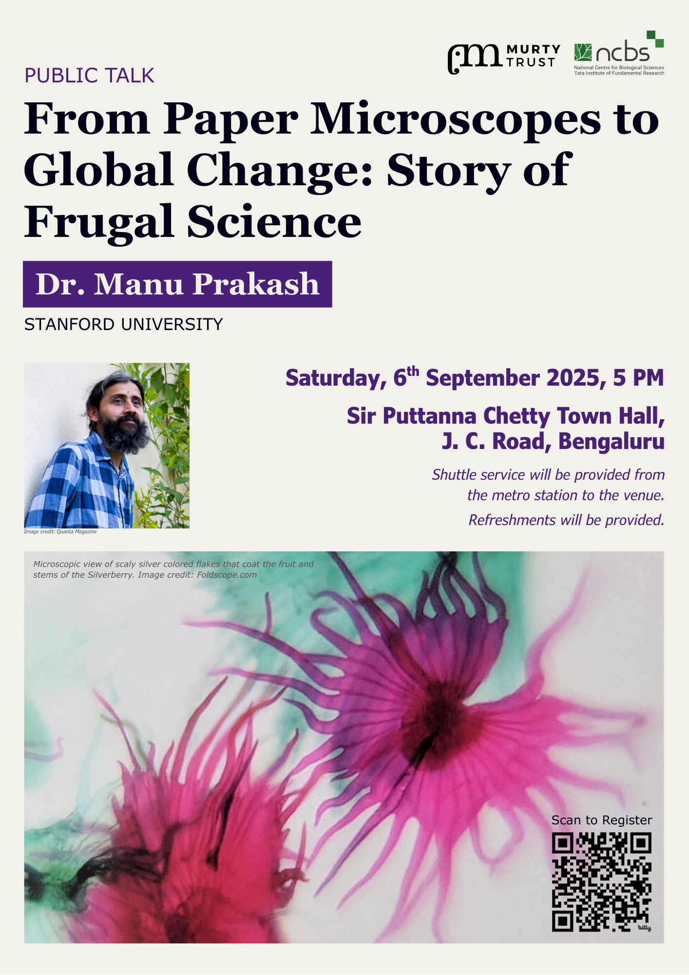 MacArthur Fellow Dr. Manu Prakash from Stanford delivered the Murty Trust’s annual public talk on “Frugal Science” on 6th September 2025 at Sir Puttanna Chetty Town Hall, Bengaluru. He demonstrated how his revolutionary Foldscope and other low-cost tools make powerful research accessible worldwide. This event was organized and hosted by the National Centre for Biological Sciences (NCBS), with support from the Murty Trust.